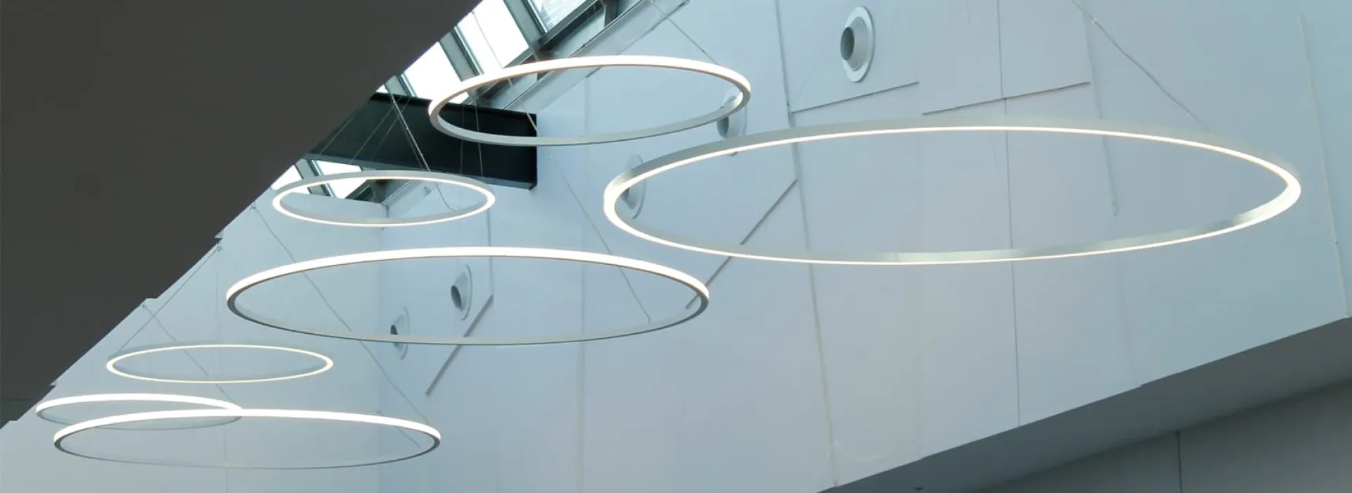 A decorative effect was sought with rings of great magnitude and, at the same time, to allow the passage of natural light from the large skylight at the entrance of the center. Diameters of 130 cm, 160 cm and 260 cm, with extruded aluminum profiles, curved, welded and assembled in a single piece.
