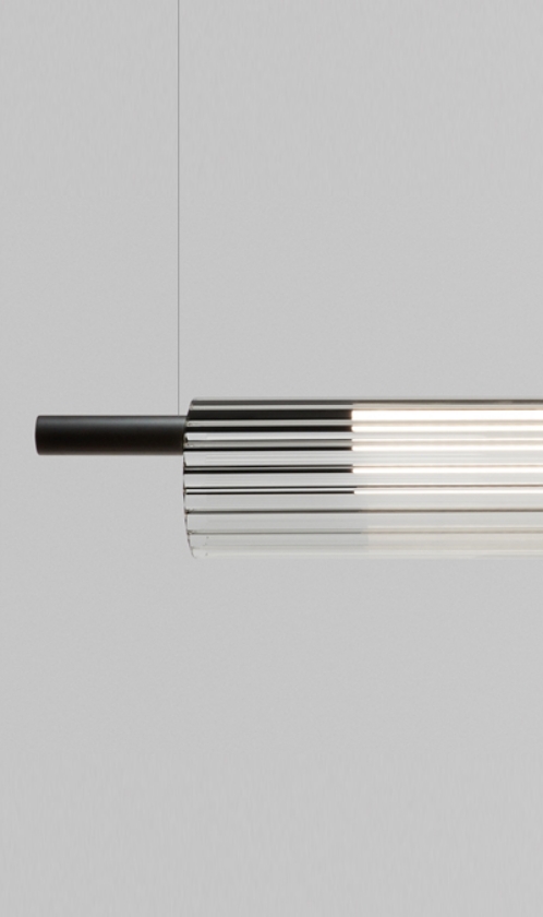 Le style de cette collection se concentre sur la présence sculpturale et la texture. La lampe utilise un tube en verre strié comme diffuseur principal, créant un élément lumineux élégant qui semble flotter dans l’espace. Son design allie la délicatesse du verre à la robustesse d’un corps en acier, filtrant la lumière pour générer une lueur douce et accueillante à forte personnalité.