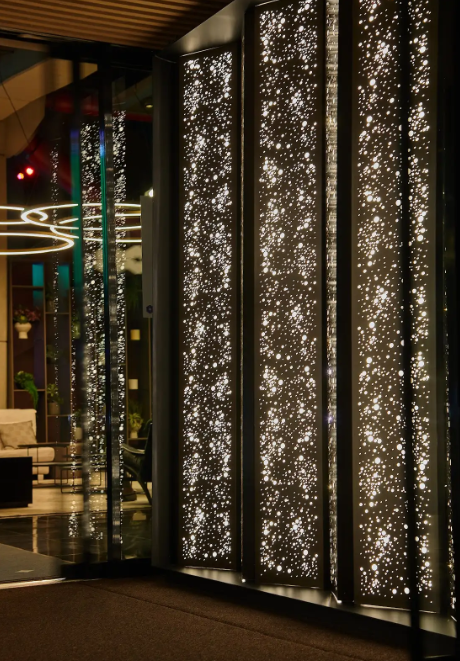 Entre les deux portes qui donnent accès à l’intérieur de la tour, il a été proposé de concevoir une lampe sur mesure représentative de ce que signifie l’espace. À cet effet, un luminaire totalement inhabituel a été conçu, créant des lattes avec plus de 10 000 points lumineux qui créent un effet visuel impressionnant, donnant l’impression que vous êtes à l’intérieur d’un aquarium rempli de gouttes d’eau, plus dans le style du monde des avatars que dans le monde réel. monde.
