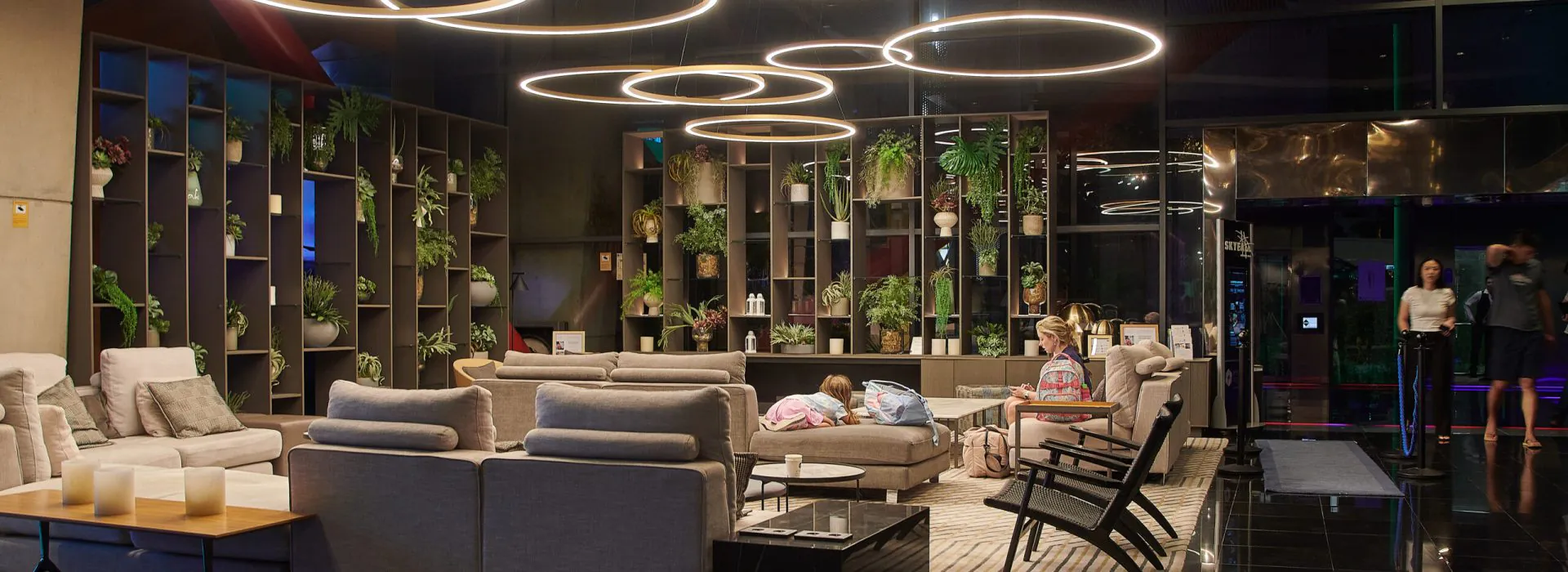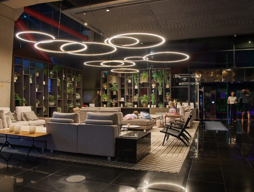 Pour l’aire de repos située dans la réception de l’hôtel, une composition spectaculaire a été choisie avec le modèle TR Down, une suspension circulaire qui est déjà un classique de la marque INSOLIT et qui a permis de générer une toile entre tous les luminaires, créant ainsi un plafond lumineux flottant pour mettre en valeur cette zone au sein du gigantesque espace d’accès à la tour.