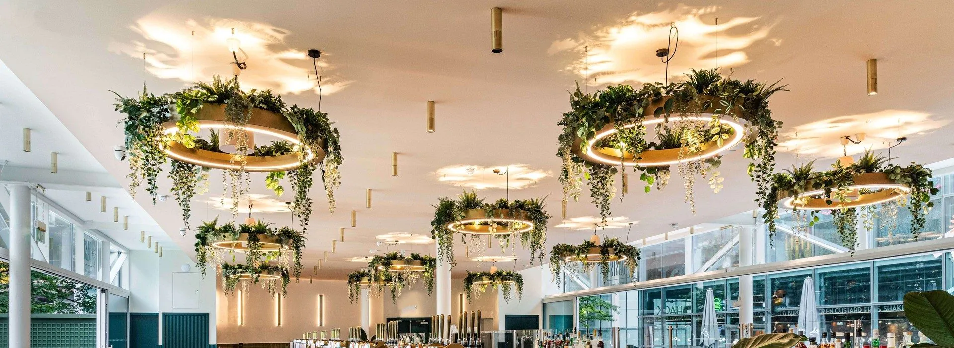 Dans le cas de l’Oasis Bar & Terrace de Canary Wharf, le design de l’éclairage joue un rôle crucial dans la création d’une atmosphère captivante et immersive qui complète l’esthétique botanique de l’espace. Les luminaires circulaires sur mesure d’Insolit, spécifiquement le TR Spot & Up Pendant dans une variation inversée, ont été utilisés comme élément central du schéma d’éclairage. Ces pièces sur mesure ont été stratégiquement placées pour éclairer les jardinières intégrées, mettant en valeur la végétation naturelle et contribuant à une ambiance sereine et inspirée de la nature. La finition dorée élégante des luminaires s’harmonise parfaitement avec la palette de couleurs luxueuses du lieu, apportant une touche sophistiquée tant dans les espaces intérieurs qu’extérieurs.